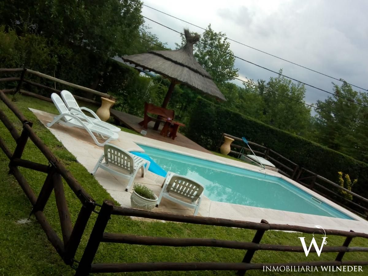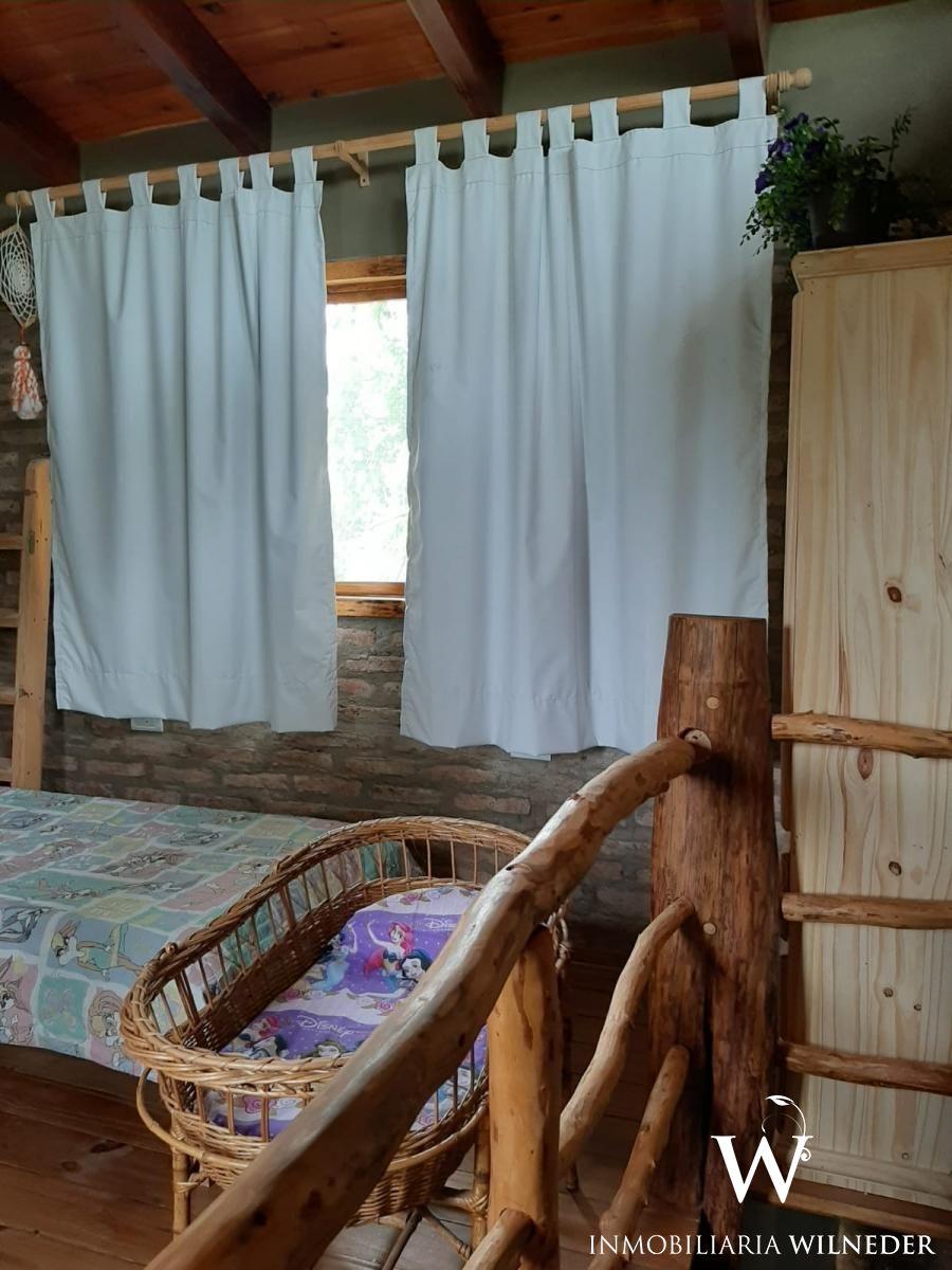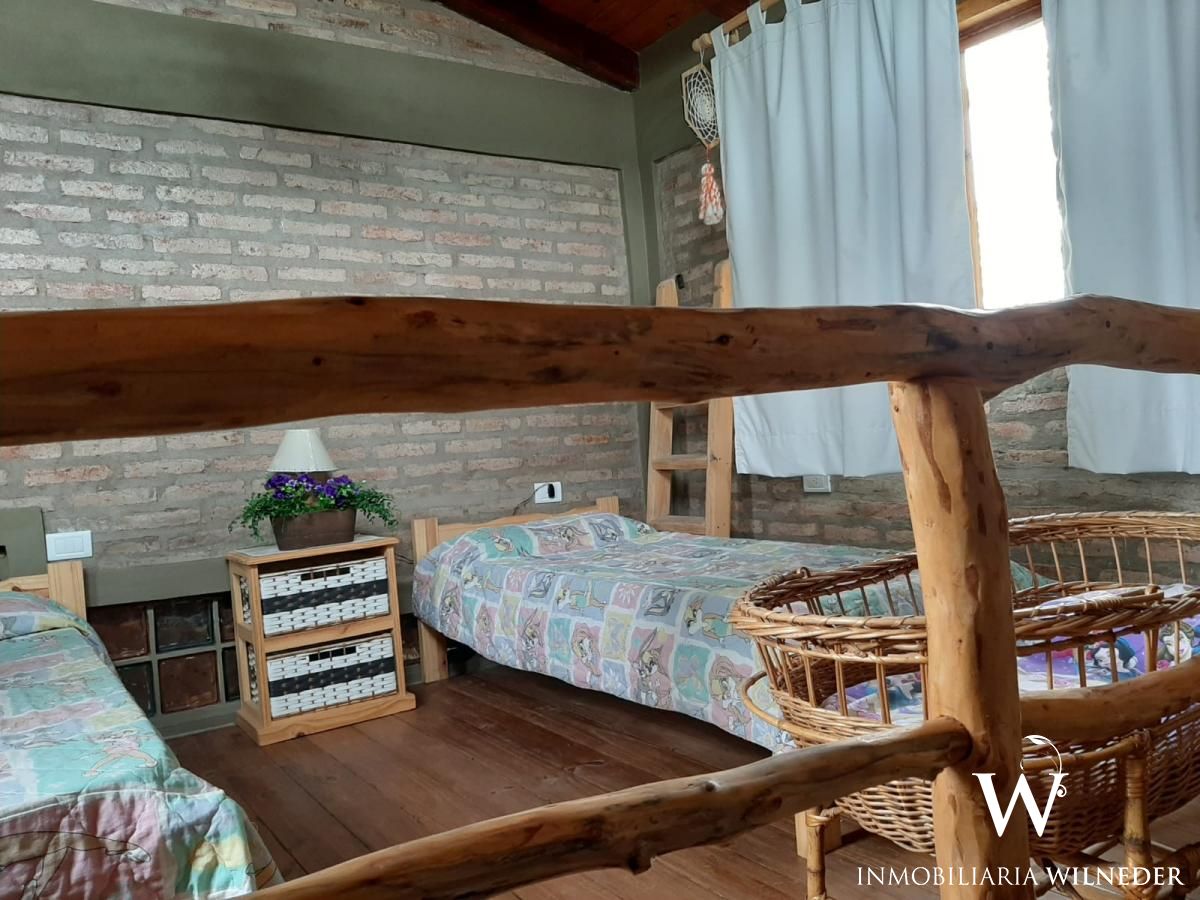 La casa principal se distribuye en dos plantas: en planta baja cuenta con 1 dormitorio, 1 baño y ambiente de cocina, living comedor. Por escalera de madera se asciende al segundo dormitorio. En el exterior galería techada con dimensiones para estacionamiento de un vehículo cómodo. Asador cubierto.
